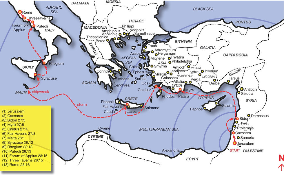 Apostle Paul's Journey as a Prisoner to Rome 59 - 60 AD - Acts 27:1 - 28:16. We follow his tracks this summer from Malta to Pozzuoli