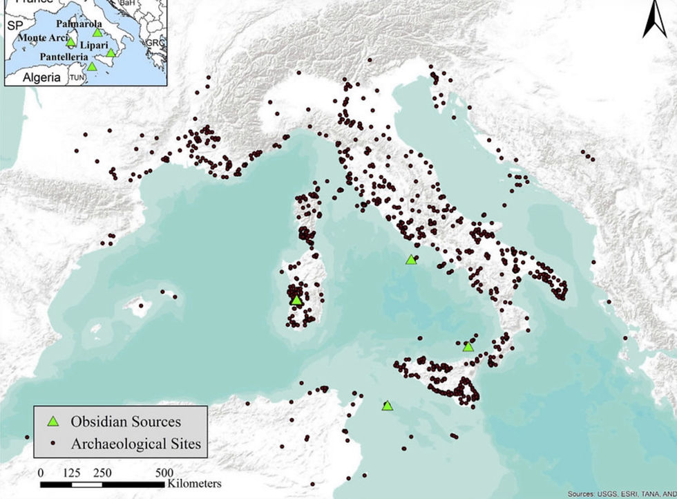Archeological Sites where Obsidian Tools were found in the Western Mediterranean